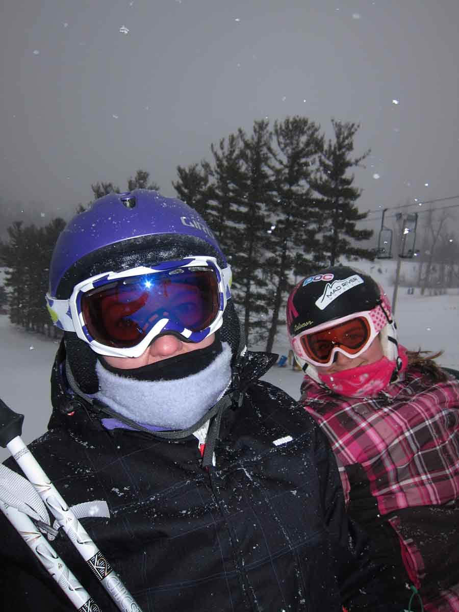 We headed up the lift with plans to ski the western edge of the park, the area we skied the least on Sunday. The few inches of fresh powder made for some excellent skiing. It was still snowing at the time which made visibility a little tough, but otherwise it was a ton of fun. Mindy and I separated from Glen at some point. I think when he went to warm his hands. We ended up taking a short green run that was loaded with Volkswagen sized moguls. It was tough! Later, we observed the sign again thinking that we must’ve made a mistake.